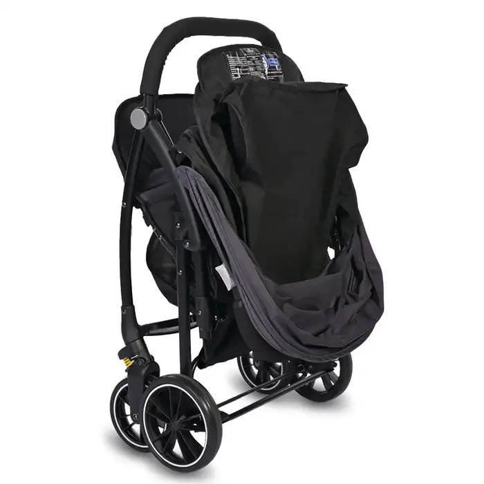 Kolica se jednostavno sklapaju jednim dodirom dugmeta poput knjige, zauzimajući malo prostora za skladištenje. Kada su sklopljena, sigurnosna prečka može se koristiti kao ručka za nošenje, što dodatno olakšava transport.